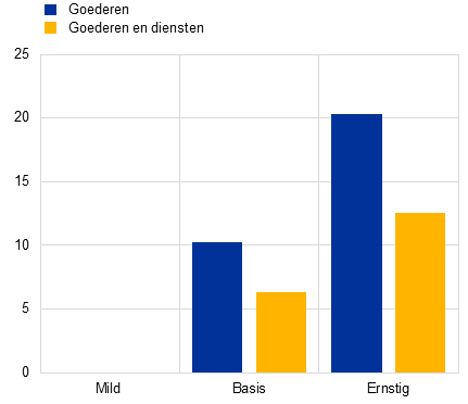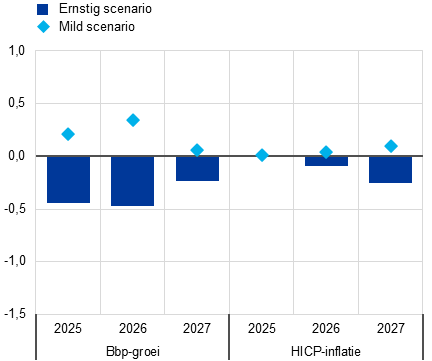 Ter illustratie van de risico’s met betrekking tot het Amerikaanse beleid rond invoerheffingen en de huidige grote onzekerheid omtrent de economische vooruitzichten voor het eurogebied zijn twee scenario’s opgesteld. Het milde scenario gaat uit van de afschaffing van bilaterale invoerheffingen tussen de Verenigde Staten en de EU (d.w.z. een wederzijds nultarief) en een snelle vermindering van de onzekerheid over het handelsbeleid tot het niveau van vóór 2018. In een dergelijk scenario zou de groei in 2025-2026 0,3-0,4 procentpunt sterker zijn dan in het basisscenario, terwijl de inflatie in 2026-2027 marginaal hoger zou zijn. Het ernstige scenario gaat uit van een verdere verhoging van de Amerikaanse invoerheffingen over de hele linie (in lijn met de aankondiging van zogenoemde wederzijdse heffingen in de Verenigde Staten), symmetrische vergeldingsmaatregelen door de EU en een aanhoudend grotere onzekerheid over het handelsbeleid. In een dergelijk scenario zouden de groeivooruitzichten voor de hele projectieperiode aanzienlijk zwakker zijn, terwijl de inflatie lager zou zijn, vooral later in de projectieperiode. Deze scenario's worden uitgewerkt in Kader 2.