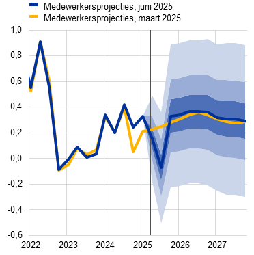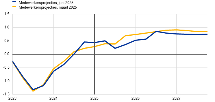 De vooruitzichten voor de economische groei van het eurogebied worden vertroebeld door handelsspanningen en verhoogde mondiale onzekerheid. Voor 2025 als geheel lijken deze effecten deels gecompenseerd te worden door een sterker dan verwachte economische bedrijvigheid in het eerste kwartaal. Dit is waarschijnlijk deels het gevolg van het naar voren halen van de uitvoer met het oog op hogere invoerheffingen. Op middellange termijn wordt de economische bedrijvigheid ondersteund door de recent aangekondigde begrotingsmaatregelen. De basisprojectie gaat ervan uit dat de Amerikaanse invoerheffingen op goederen vanuit de EU, die met 10% zijn toegenomen, van kracht blijven gedurende de hele projectieperiode. Samen met de verhoogde onzekerheid rond het handelsbeleid en de recente waardestijging van de euro zullen de hogere invoerheffingen de uitvoer, de investeringen en – in mindere mate – de consumptie van het eurogebied drukken. Daarentegen zouden de nieuwe overheidsuitgaven voor infrastructuur en defensie, vooral in Duitsland, de binnenlandse vraag in het eurogebied vanaf 2026 een boost moeten geven. Al met al blijven de voorwaarden aanwezig voor een opleving van de bbp-groei in het eurogebied gedurende de projectieperiode. Vooral de stijgende reële inkomens en werkgelegenheid, de minder restrictieve financieringsvoorwaarden – met name door de recente monetairbeleidsbeslissingen – en een opleving van de buitenlandse vraag later in de projectieperiode zouden een geleidelijk herstel moeten ondersteunen. De gemiddelde reële bbp-groei op jaarbasis komt volgens de projecties uit op 0,9% in 2025, 1,1% in 2026 en 1,3% in 2027. Vergeleken met de door medewerkers van de ECB samengestelde macro-economische projecties van maart 2025 zijn de vooruitzichten voor de bbp-groei voor 2025 ongewijzigd, als gevolg van beter dan verwachte binnenkomende gegevens die grotendeels worden gecompenseerd door de effecten van de handelsspanningen en de appreciatie van de euro. De handelsspanningen en de sterkere wisselkoers hebben voor 2026 geleid tot een neerwaartse bijstelling van de groei, terwijl de groei voor 2027 ongewijzigd is gebleven.[1]