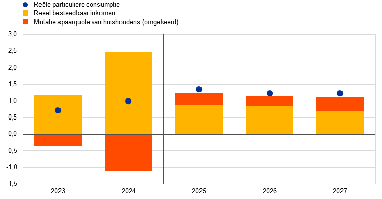 Een extra bron van verkrapping in 2025 is de verdere afbouw van de resterende energiesteunmaatregelen, terwijl de overheidsconsumptie en -investeringen blijven groeien en de begrotingsoverdrachten toenemen. De versoepeling van niet-discretionaire factoren is het gevolg van tegenvallende inkomsten en andere resterende belastingbedragen, terwijl de samenstellingseffecten, die in 2024 sterk positief waren, zowel in 2025 als gedurende de rest van de projectieperiode neutraal zijn.