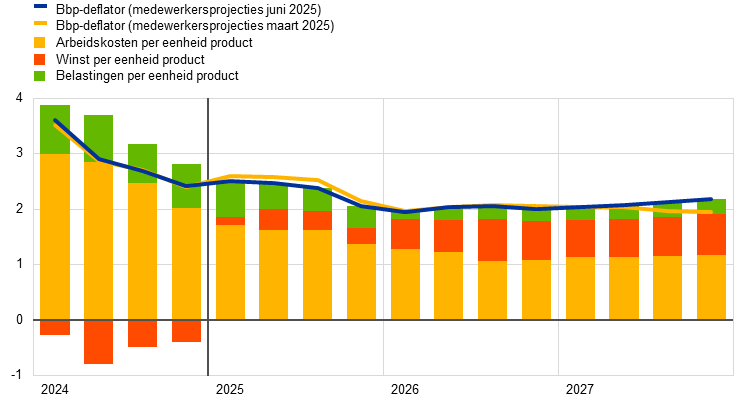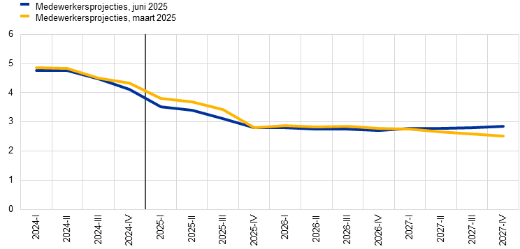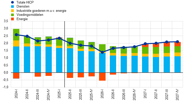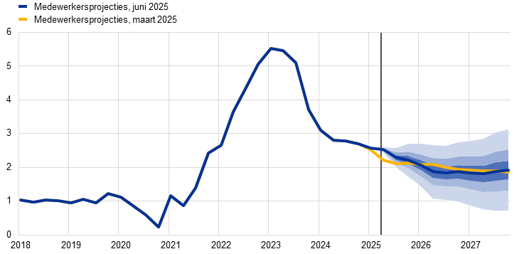 Hoewel de totale inflatie, zoals gemeten aan de hand van de geharmoniseerde consumptieprijsindex (HICP), op korte termijn waarschijnlijk onder de 2% blijft, keert deze op middellange termijn naar verwachting terug naar de doelstelling. Verwacht wordt dat de inflatie in de loop van 2025 daalt en in het eerste kwartaal van 2026 het laagste punt van 1,4% bereikt, om daarna weer te stijgen naar 2,0% in 2027. De daling van de totale inflatie in 2025 wordt deels veroorzaakt door de negatieve energie-inflatie als gevolg van de recente daling van de olieprijzen en de groothandelsprijzen voor aardgas. De energie-inflatie blijft naar verwachting negatief tot 2027, wanneer nieuwe maatregelen ter beperking van klimaatverandering van kracht worden in het kader van het nieuwe emissiehandelssysteem (ETS2). Na een tijdelijke stijging in het tweede kwartaal van 2025 daalt de voedselinflatie naar verwachting tot iets boven de 2% in 2027. De HICP-inflatie exclusief energie en voedingsmiddelen (HICPX) daalt naar verwachting als gevolg van de dienstencomponent, naarmate het effect van de vertraagde prijsaanpassingen voor sommige producten wegebt, de loondruk afneemt en de lagere energieprijzen doorwerken in de prijsketen. De loongroei zou de neerwaartse trend moeten blijven volgen naarmate de druk om eerdere reële loonverliezen te recupereren wegebt. In combinatie met een herstel van de productiviteitsgroei leidt dit naar verwachting tot een aanzienlijk tragere groei van de arbeidskosten per eenheid product. De externe prijsdruk, zoals zichtbaar in de invoerprijzen, blijft naar verwachting gematigd, uitgaande van een ongewijzigd heffingenbeleid van de EU. Hierbij is rekening gehouden met enige neerwaartse druk als gevolg van de sterkere euro en de daling van de prijzen van energiegrondstoffen in de afgelopen maanden. Vergeleken met de projecties van maart 2025 zijn de vooruitzichten voor de totale HICP-inflatie voor zowel 2025 als 2026 met 0,3 procentpunt neerwaarts bijgesteld vanwege lagere aannames voor de prijzen van energiegrondstoffen en de waardestijging van de euro, terwijl deze voor 2027 ongewijzigd zijn gebleven.