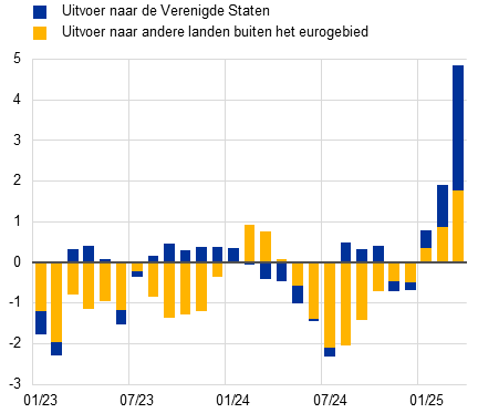 Toelichting: Voor paneel a) betreft de meest recente waarneming april 2025. Voor paneel b) zijn de onderliggende gegevens voor seizoen gecorrigeerd. Aangezien de gegevens over het uitvoervolume van het eurogebied voor maart 2025 niet beschikbaar waren op de afsluitdatum, wordt het meest recente gegevenspunt benaderd door de waarden voor maart te defleren met de industriële uitvoerprijzen. De meest recente waarnemingen betreffen maart 2025.