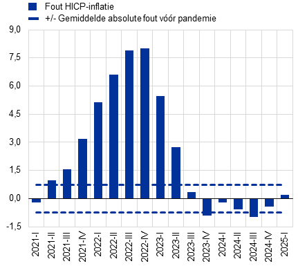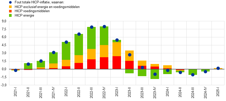 De inflatieprojecties voor 2021 en 2022 hebben de prijsdruk aanzienlijk en aanhoudend onderschat. De nauwkeurigheid is verbeterd sinds 2023, waarbij de fouten voor de projecties op middellange termijn (Grafiek B) van teken zijn veranderd. De werkelijke inflatie in 2021 en 2022 bleek aanzienlijk hoger dan verwacht, voornamelijk als gevolg van de uitzonderlijke combinatie van sterk stijgende prijzen voor energiegrondstoffen (met name voor gas), knelpunten in het mondiale aanbod en een robuuste vraag na de pandemie, wat ook leidde tot enkele niet-lineaire effecten bij de transmissie van de schokken. De factoren die aan deze fouten ten grondslag liggen, zijn uitvoerig besproken in analyses van medewerkers van de ECB.[15] Naarmate de inflatoire druk in 2023 en 2024 afnam en de medewerkers de technische aannames en de analytische instrumenten verbeterden, namen de projectiefouten af en kwamen ze grotendeels in de buurt van de gemiddelden van vóór de pandemie. Tegelijkertijd werden projectiefouten één jaar vooruit aanhoudend negatief, zij het maar tot vorig jaar.