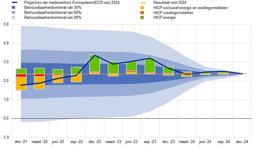 Toelichting: De data verwijzen naar de publicatie van elke editie van de projecties. De blauwe lijn toont de door medewerkers van het Eurosysteem/de ECB opgestelde projectie voor de inflatie op jaarbasis in 2024 bij elke editie. In de balken zijn de voorspelfouten uitgesplitst naar inflatiecomponent. De gearceerde delen geven het betrouwbaarheidsinterval van 30%, 60% en 90% weer op basis van eerdere inflatieprojectiefouten, gecentreerd rond het definitieve inflatieresultaat voor 2024, zoals ze ten tijde van de projectie zouden zijn geraamd. Voor meer informatie over de methodologie, zie het kader Illustratie van de onzekerheid over de projecties in de door medewerkers van de ECB samengestelde macro-economische projecties voor het eurogebied van maart 2023.