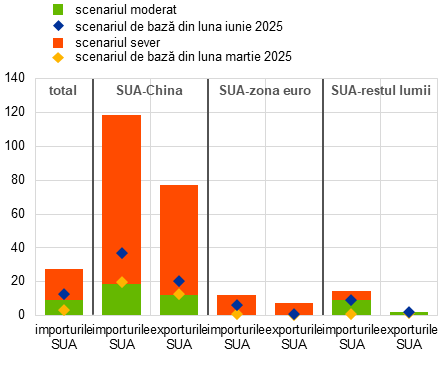 Note: Tabloul a) prezintă media ponderată a ratelor tarifare la nivel de produs, utilizând fluxurile comerciale din 2023. Barele verzi se referă la scenariul moderat (China 10%, UE 0%, Canada și Mexic 25% pentru bunurile din afara USCMA, restul lumii 10% și tarifele sectoriale mondiale). Diamantele albastre (galbene) reprezintă nivelul de referință al tarifelor în cadrul proiecțiilor din iunie 2025 (martie 2025). Delta scenariului sever raportat la scenariul moderat este evidențiată de barele roșii. În cazul tabloului b), cele mai recente observații se referă la luna aprilie 2025. Tabloul b) prezintă media ponderată a ratelor tarifare la nivel de produs, utilizând fluxurile comerciale din 2024, pentru fiecare scenariu.
