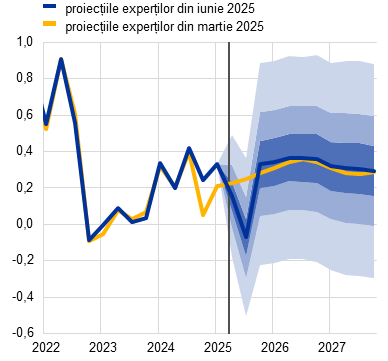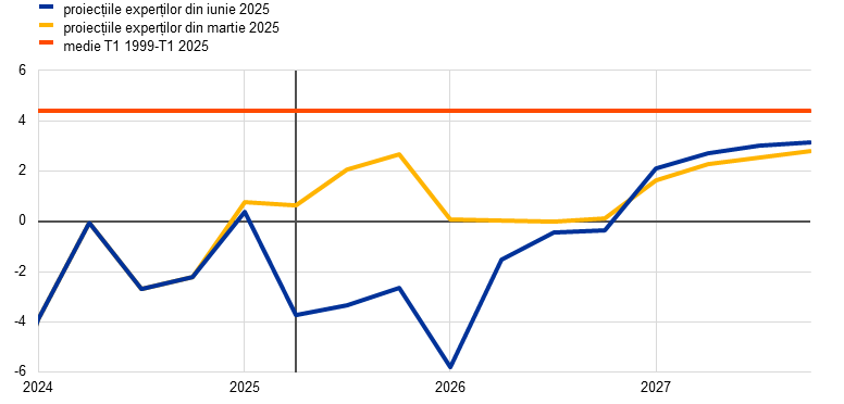 Notă: Cifrele aferente PIB real se referă la medii anuale ale datelor ajustate sezonier și cu numărul zilelor lucrătoare. Datele istorice pot fi diferite de cele mai recente date publicate de Eurostat, având în vedere publicarea acestora după data-limită pentru proiecții. Revizuirile sunt calculate pe baza valorilor rotunjite. Scenariile alternative se axează pe incertitudinile asociate tarifelor impuse de SUA și politicilor comerciale, fiind prezentate în Caseta 2. Datele pentru proiecția de bază din luna iunie 2025 pot fi descărcate, tot cu frecvență trimestrială, din baza de date conținând proiecții macroeconomice de pe website-ul BCE.