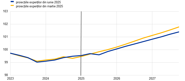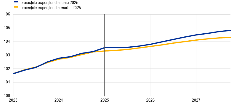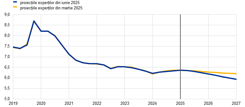 Deși este probabil ca inflația totală, măsurată prin indicele armonizat al prețurilor de consum (IAPC), să se mențină sub nivelul de 2% pe termen scurt, se anticipează revenirea acesteia la nivelul țintei pe termen mediu. Inflația este proiectată să se reducă în cursul anului 2025 și să atingă un nivel minim de 1,4 % în trimestrul I 2026, urmând să revină la 2,0% în 2027. Se consideră că reculul inflației totale pe parcursul anului 2025 va fi parțial determinat de dinamica negativă a prețurilor produselor energetice ca urmare a scăderii recente a cotațiilor petrolului și a prețurilor angro ale gazelor naturale. Potrivit estimărilor, dinamica prețurilor produselor energetice va rămâne negativă până în 2027, când vor intra în vigoare noi măsuri de atenuare a schimbărilor climatice în contextul noii scheme de comercializare a certificatelor de emisii (ETS2). După o creștere temporară în trimestrul II 2025, se previzionează o scădere a dinamicii prețurilor alimentelor în ritmuri ușor peste 2% în 2027. Se anticipează o reducere a inflației IAPC exclusiv produse energetice și alimente (IAPCX), generată de componenta „servicii”, pe măsură ce efectele ajustărilor decalate ale prețurilor unor produse se estompează, presiunile salariale se diminuează, iar impactul prețurilor mai scăzute ale produselor energetice se transmite prin intermediul lanțului de stabilire a prețurilor. Dinamica salarială ar trebui să urmeze în continuare o traiectorie descendentă, pe fondul disipării presiunilor asociate recuperării pierderilor salariale reale înregistrate anterior. Se estimează că aceasta, alături de redresarea dinamicii productivității, va conduce la decelerarea semnificativă a creșterii costurilor unitare cu forța de muncă. Potrivit anticipațiilor, presiunile din surse externe asupra prețurilor, reflectate în prețurile de import, se vor menține moderate, în ipoteza că politicile UE privind tarifele comerciale rămân neschimbate, unele presiuni în sensul scăderii fiind generate de aprecierea euro și de scăderea prețurilor materiilor prime energetice din ultimele luni. Comparativ cu proiecțiile din luna martie 2025, perspectivele inflației IAPC totale sunt revizuite în sens descendent cu 0,3 puncte procentuale atât pentru 2025, cât și pentru 2026, pe seama ipotezelor privind ieftinirea materiilor prime energetice și a aprecierii euro, nefiind revizuite pentru 2027.