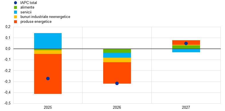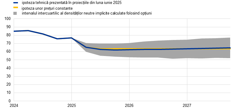 Notă: Revizuirile sunt exprimate ca procente pentru niveluri și ca puncte procentuale pentru ritmurile de creștere și procentele pe an. Revizuirile pentru ritmurile de creștere și ratele dobânzilor se calculează utilizând valori rotunjite la o zecimală, în timp ce revizuirile raportate ca variații procentuale sunt calculate pe baza valorilor nerotunjite. Ipotezele tehnice referitoare la ratele dobânzilor și la prețurile materiilor prime în zona euro se bazează pe anticipațiile pieței, data-limită pentru includerea ultimelor informații fiind 14 mai 2025. Prețurile petrolului se referă la cotațiile spot și futures ale țițeiului Brent. Prețurile gazelor naturale se referă la cotațiile spot și futures ale gazelor naturale tranzacționate pe platforma TTF din Țările de Jos. Prețurile energiei electrice se referă la cotația spot și futures medie angro pentru primele cinci țări ca mărime din zona euro. Cotația futures „sintetică” a certificatelor aferente ETS1 (EU Emissions Trading System allowances – EUA) este derivată din valoarea interpolată liniară la sfârșit de lună a celor mai apropiate două burse europene de energie. Se calculează apoi o medie a cotațiilor futures lunare ale certificatelor aferente EUA pentru a produce o frecvență echivalentă cu cea anuală. În absența tranzacționării certificatelor ETS2, ipotezele privind prețurile au fost stabilite de experți la pragul de preț peste care vor fi eliberate certificate suplimentare, prețul fiind actualizat la cel pentru anul 2027 (pentru mai multe detalii, a se vedea caseta intitulată „Evaluarea impactului politicilor de tranziție asociate schimbărilor climatice asupra creșterii economice și asupra inflației” din raportul privind proiecțiile macroeconomice ale experților Eurosistemului din decembrie 2024). Traiectoriile prețurilor materiilor prime corespund celor implicite de pe piețele futures, înregistrate în perioada de zece zile lucrătoare încheiată la data-limită. În ceea ce privește cursurile de schimb bilaterale, se previzionează că acestea vor rămâne nemodificate pe parcursul orizontului de proiecție, la nivelurile medii înregistrate în perioada de zece zile lucrătoare încheiată la data-limită. Ipotezele privind randamentele nominale ale obligațiunilor de stat cu scadența la 10 ani din zona euro se bazează pe media ponderată cu PIB anual a randamentelor obligațiunilor cu scadența la 10 ani ale țărilor. Acolo unde există datele necesare, randamentele nominale ale obligațiunilor de stat cu scadența la 10 ani specifice fiecărei țări sunt definite ca randamentele obligațiunilor de referință cu scadența la 10 ani, extinse utilizând randamentele forward la par derivate, la data-limită, din curbele corespunzătoare ale randamentelor specifice fiecărei țări. Pentru celelalte țări, randamentele obligațiunilor de stat cu scadența la 10 ani specifice fiecărei țări sunt definite ca randamentul obligațiunilor de referință cu scadența la 10 ani extins utilizând un spread constant (înregistrat la data-limită) în cadrul ipotezei tehnice privind ratele dobânzilor pe termen lung fără risc din zona euro.