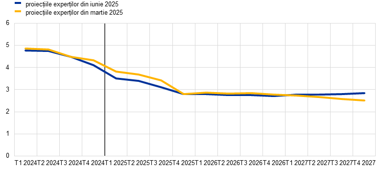 Conform proiecțiilor, rata inflației măsurată prin prețurile de consum la nivel mondial se va modera pe parcursul orizontului de proiecție, în pofida creșterii proiectate a inflației în Statele Unite ale Americii, care reflectă măsurile tarifare. În rândul economiilor dezvoltate, pe lângă Statele Unite ale Americii, inflația din Regatul Unit a fost revizuită în sens ascendent pentru 2025, ca urmare a rezultatelor peste așteptări înregistrate în ultimele luni și a dinamicii salariale mai puternice. Proiecțiile privind inflația pentru economiile de piață emergente au fost, de asemenea, revizuite ușor în sens ascendent, reflectând în special evoluțiile structurale negative din Rusia și impactul deprecierii bruște a lirei turcești asupra inflației din Turcia. În termeni anuali, se previzionează că inflația globală se va menține pe o traiectorie descendentă, reducându-se la 3,3% în acest an de la 4,0% în 2024 și ajungând ulterior la nivelul de 2,8% în 2026 și 2,5% în 2027. Comparativ cu proiecțiile din luna martie, aceasta a fost revizuită în sens ascendent cu 0,1 puncte procentuale pentru anul 2026.