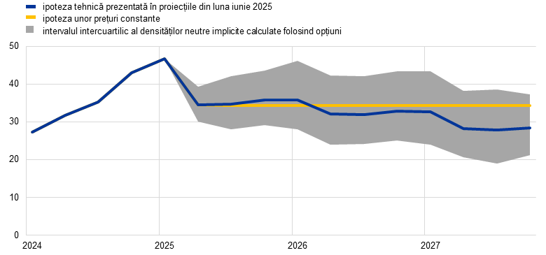 Notă: Densitățile implicite calculate folosind opțiuni atât pentru prețurile gazelor naturale, cât și pentru cele ale petrolului sunt preluate din cotațiile pieței la 14 mai 2025 pentru opțiunile privind cotațiile futures ale țițeiului Brent tranzacționat pe bursa ICE și cotațiile futures ale gazelor naturale tranzacționate pe platforma TTF din Țările de Jos, cu date de expirare trimestriale fixe.