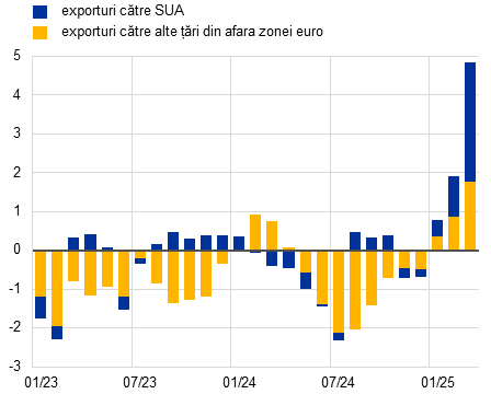 Notă: În cazul tabloului a), cele mai recente observații se referă la luna aprilie 2025. În cazul tabloului b), datele de bază sunt ajustate sezonier. Întrucât datele privind volumul exporturilor zonei euro pentru luna martie 2025 nu erau disponibile la data-limită, cele mai recente date sunt aproximate prin deflatarea valorilor din luna martie cu prețurile exporturilor industriale. Cele mai recente date se referă la luna martie 2025.