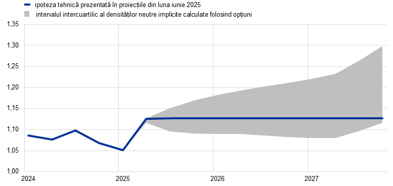 Notă: O creștere implică aprecierea euro. Cea de-a 25-a percentilă și cea de-a 75-a percentilă se referă la densitățile neutre implicite calculate folosind opțiuni pentru cursul de schimb USD/EUR la data de 14 mai 2025. Efectele macroeconomice sunt prezentate ca medii ale unei serii de modele macroeconomice elaborate de experții BCE și ai Eurosistemului.