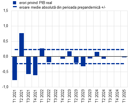 Acuratețea proiecțiilor privind creșterea PIB în zona euro a variat ulterior pandemiei de COVID-19: proiecțiile pe termen scurt s-au dovedit exacte, însă ritmul redresării pe termen mediu a fost deseori supraestimat (Graficul A). În timpul pandemiei, până la sfârșitul anului 2021, atât proiecțiile pe termen scurt, cât și cele pe termen mediu au prezentat erori neobișnuit de mari, reflectând provocarea de a elabora proiecții privind creșterea economică într-o perioadă marcată de restricții și redeschideri fără precedent. După anul 2022, erorile de proiecție pe termen scurt au scăzut substanțial, menținându-se ulterior la un nivel inferior sau apropiat de cel al erorii medii absolute din perioada anterioară pandemiei. Acest lucru sugerează faptul că, chiar și în contextul mai multor șocuri majore, proiecțiile recente pe termen scurt privind PIB au fost, în general, fiabile, fără nicio tendință manifestă. În schimb, proiecțiile pe termen mediu au supraestimat sistematic creșterea între trimestrul III 2022 și trimestrul II 2024, erorile pe un an depășind eroarea medie absolută din perioada anterioară pandemiei între trimestrul IV 2022 și trimestrul IV 2023. Aceste supraestimări au reflectat așteptări optimiste cu privire la intensitatea redresării ulterior crizei energetice. Mai exact, în anul 2022, aceste erori au fost generate de redresarea sub așteptări a schimburilor comerciale internaționale, de prețurile mai ridicate ale produselor energetice, de condițiile de finanțare mai restrictive și de nivelul ridicat de incertitudine, la care s-a adăugat impactul subestimat al inflației asupra veniturilor reale. În anul 2023, nivelurile sub așteptări ale cererii externe, o politică monetară mai restrictivă și o monedă euro mai puternică au contribuit, de asemenea, la rezultate mai scăzute privind creșterea economică decât s-a prognozat.[14] În ultimul an, acuratețea proiecțiilor pe un an s-a îmbunătățit semnificativ, deși tendința de a supraestima ușor robustețea perspectivelor creșterii economice a continuat.