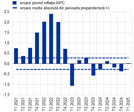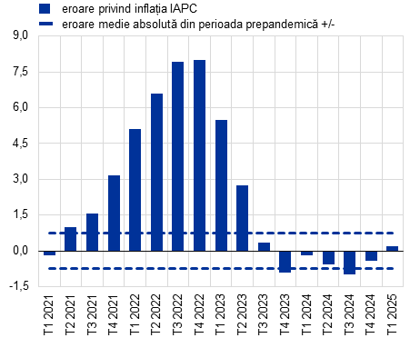 Pe scurt, erorile de proiecție s-au diminuat începând cu a doua jumătate a anului 2023, proiecțiile experților Eurosistemului/BCE înregistrând, în ansamblu, rezultate bune, dar având în vedere șocurile actuale care afectează zona euro, prognozarea rămâne dificilă. Erorile au fost deosebit de mari în 2021 și 2022, reflectând impactul șocurilor extraordinare și suprapuse. Ulterior, acuratețea previziunilor s-a îmbunătățit, în special în cazul inflației exclusiv produse energetice și alimente, în concordanță cu disiparea treptată a acestor șocuri. Cazul din 2024 ilustrează faptul că, în pofida unor supraestimări și subestimări, erorile de proiecție privind inflația s-au menținut în limitele normale din punct de vedere istoric. În aceste condiții, prognozarea rămâne deosebit de dificilă, având în vedere șocurile actuale care afectează perspectivele economice atât la nivel internațional, cât și la nivelul zonei euro. Este așadar necesar să se manifeste prudență și agilitate în procesul de previzionare, în special în contextul unui grad ridicat de incertitudine cu privire la evoluția și transmiterea acestor șocuri.