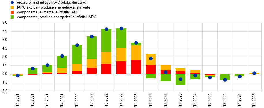 Supraestimările inflației din ultimul an s-au datorat aproape exclusiv componentei volatile a energiei, în timp ce inflația de bază este deosebit de exactă (Graficul C). În urma invadării Ucrainei de către Rusia, prețurile gazelor au crescut brusc, ceea ce a condus la erori substanțiale în prognozele privind dinamica prețurilor produselor energetice. Erorile la nivelul componentei „alimente” a inflației IAPC și al inflației IAPC exclusiv produse energetice și alimente au crescut, de asemenea, în timp, în condițiile în care firmele au transmis presiunile asupra costurilor în sens mai larg și mai frecvent, iar inflația a devenit mai persistentă la nivelul serviciilor, ca urmare a cererii puternice post-pandemie. Începând din anul 2023, erorile de proiecție la nivelul tuturor componentelor s-au redus treptat. Erorile de proiecție pe un an au devenit negative începând cu trimestrul IV 2023, ca urmare a erorilor privind componenta „produse energetice” a inflației, în mare parte din cauza prețurilor angro ale gazelor naturale mai mici decât cele incluse în cotațiile futures. Componenta „alimente” a inflației și inflația de bază au fost în deplină concordanță cu proiecțiile, începând cu exercițiul din luna iunie 2024.