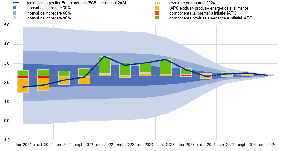 Notă: Datele se referă la publicarea fiecărui exercițiu de proiecție. Linia albastră indică proiecția experților Eurosistemului/BCE privind inflația anuală din 2024 în fiecare exercițiu. Descompunerea erorii de prognoză pe componente ale inflației. Zonele estompate reprezintă intervalele de încredere de 30%, 60% și 90% pe baza erorilor de proiecție anterioare privind inflația, axate pe rezultatul final al inflației din 2024, astfel cum ar fi fost estimate acestea la momentul exercițiului. Pentru detalii referitoare la metodologie, a se vedea caseta intitulată „Reprezentarea incertitudinilor asociate proiecțiilor” din proiecțiile macroeconomice pentru zona euro ale experților BCE din luna martie 2023.