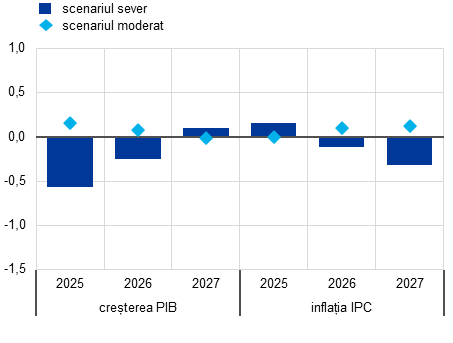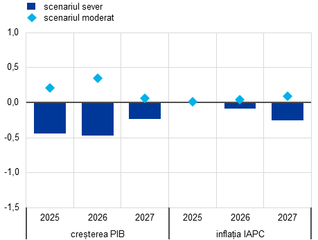 Au fost elaborate două scenarii pentru evidențierea riscurilor legate de politicile tarifare ale SUA și a gradului actual ridicat de incertitudine asociat perspectivelor economice ale zonei euro. Un scenariu moderat prevede eliminarea tarifelor bilaterale între Statele Unite și UE (mai exact, tarife „zero pentru zero”) și reducerea rapidă a incertitudinilor asociate politicilor comerciale la nivelurile înregistrate înainte de 2018. Într-un astfel de scenariu, creșterea economică ar fi cu 0,3-0,4 puncte procentuale superioară celei din scenariul de bază în perioada 2025-2026, în timp ce inflația ar fi ușor mai ridicată în perioada 2026-2027. Un scenariu sever prevede o nouă majorare generalizată a tarifelor impuse de SUA (în concordanță cu anunțarea așa-numitelor tarife „reciproce” în Statele Unite), represalii similare din partea UE și amplificarea în continuare a incertitudinilor asociate politicilor comerciale. Într-un astfel de scenariu, perspectivele creșterii economice ar fi considerabil mai modeste pe parcursul orizontului de proiecție, iar inflația ar fi mai scăzută, mai ales către finele orizontului de proiecție. Aceste scenarii sunt prezentate detaliat în Caseta 2.