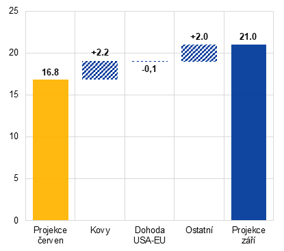 - Celková efektivní celní sazba USA na dovoz zboží od všech obchodních partnerů vzrostla z 16,8 % v červnových projekcích na 21,0 % (viz graf A, panel b). To odráží zdvojnásobení plošných cel na ocel a hliník (z 25 % v projekcích z června 2025 na 50 %) a doplnění 407 derivátů oceli a hliníku na seznam výrobků zasažených celní sazbou, nová plošná cla na měď (50 %), dvoustranné obchodní dohody podepsané s klíčovými obchodními partnery (např. s Evropskou unií, Japonskem, Jižní Koreou a Vietnamem), vyšší vzájemné sazby zavedené 7. srpna v případě zemí, s nimiž nebylo dosaženo žádné obchodní dohody (např. u Indie a Švýcarska), zvýšení cel na brazilský vývoz (na 50 %) a kanadský vývoz (zvýšení cla na zboží, které není v souladu s dohodou mezi Spojenými státy, Mexikem a Kanadou, na 35 %) a sekundární cla na Indii (navýšení o dalších 25 procentních bodů) s cílem penalizovat její nákupy ruské ropy.