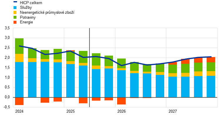 Výhled inflace odpovídá tomu, že se inflace stabilizuje poblíž 2% střednědobého cíle. Celková inflace, měřená harmonizovaným indexem spotřebitelských cen (HICP), by měla po zbytek roku 2025 kolísat poblíž 2 %, v roce 2026 klesnout na 1,7 % a následně se v roce 2027 zotavit na úroveň 1,9 %. Pokles v roce 2026 odráží další postupné snižování cen neenergetických složek, zatímco růst cen energií by měl zůstat volatilní, ale v horizontu projekcí by měl zesílit, částečně v důsledku spuštění systému EU pro obchodování s emisemi ETS2 v roce 2027. Očekává se, že ceny potravin zpočátku i nadále porostou rychleji, neboť se projeví zpožděné dopady dřívějšího růstu cen mezinárodních potravinářských komodit. V letech 2026 a 2027 by však růst měl zmírnit na úroveň mírně nad 2 %. Inflace měřená HICP bez započtení energií a potravin (HICPX) by měla klesat s tím, jak poleví mzdové tlaky a zmírní se růst cen služeb a jak se posilování eura projeví v cenovém řetězci a omezí růst cen zboží. Očekává se, že nižší růst mezd vyplývající z již realizované kompenzace ztrát reálných mezd v minulosti a oživení růstu produktivity povedou k výrazně pomalejšímu růstu jednotkových mzdových nákladů. V porovnání s projekcemi z června 2025 byl výhled celkové inflace měřené HICP revidován pro rok 2025 i 2026 o 0,1 procentního bodu směrem nahoru. Důvodem jsou vyšší aktuální údaje o cenách energetických komodit i předpoklady o jejich budoucím vývoji a také zpožděné účinky vyšších mezinárodních cen potravinářských komodit, které převažují nad posílením eura. Očekává se, že v roce 2027 budou převládat zpožděné účinky posilování eura, což povede k revizi o 0,1 procentního bodu směrem dolů.