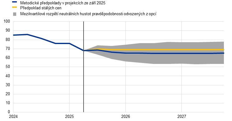 Poznámky: Revize jsou vyjádřeny v procentech v případě úrovní, v procentních bodech v případě tempa růstu a v p. a. Revize tempa růstu a úrokových sazeb se vypočítávají na základě údajů zaokrouhlených na jedno desetinné místo, zatímco revize vykázané jako procentní změny se vypočítávají z nezaokrouhlených hodnot. Metodické předpoklady o úrokových sazbách v eurozóně a cenách komodit vycházejí z tržních očekávání s datem pro uzávěrku údajů 15. srpna 2025. Ceny ropy se týkají spotových cen a cen futures ropy Brent. Ceny plynu se týkají spotových cen a cen futures na plyn na nizozemské burze TTF. Ceny elektřiny se týkají průměrné velkoobchodní spotové ceny a ceny futures v pěti největších zemích eurozóny. „Syntetická“ cena futures na povolenky v systému ETS1 (dále též „EUA“) se odvozuje jako lineárně interpolovaná hodnota dvou nejbližších futures na EUA na Evropské energetické burze na konci měsíce. Měsíční ceny futures na EUA jsou poté průměrovány tak, aby poskytly ekvivalent roční frekvence. Vzhledem k neexistenci významnějšího obchodování s povolenkami v rámci systému ETS2 stanovili odborníci sestavující projekce předpoklady o cenách na úrovni prahové ceny, při jejímž překročení budou emitovány další povolenky, přičemž cena byla aktualizována za použití cen v roce 2027 (další podrobnosti viz box nazvaný „Posouzení dopadu transformačních opatření souvisejících se změnou klimatu na hospodářský růst a inflaci“ v projekcích z prosince 2024 sestavených odborníky Eurosystému). Vývoj cen komodit implikují trhy s futures v deseti pracovních dnech končících dnem uzávěrky. Dvoustranné směnné kurzy by měly v horizontu projekcí zůstat beze změny, a to na průměrné úrovni platné během deseti pracovních dnů končících dnem uzávěrky. Předpoklady nominálních výnosů z desetiletých státních dluhopisů v eurozóně vycházejí z průměru výnosů desetiletých dluhopisů těchto zemí váženého hodnotami ročního HDP. Existují-li potřebné údaje, jsou nominální výnosy desetiletých státních dluhopisů jednotlivých zemí definovány jako výnosy referenčních desetiletých dluhopisů prodloužené za použití forwardových nominálních výnosů odvozených k datu uzávěrky z odpovídajících výnosových křivek jednotlivých zemí. V případě ostatních zemí jsou výnosy desetiletých státních dluhopisů jednotlivých zemí definovány jako výnos referenčních desetiletých dluhopisů prodloužený za použití konstantního rozpětí (pozorovaného k datu uzávěrky) vůči předpokládané bezrizikové dlouhodobé úrokové sazby v eurozóně.