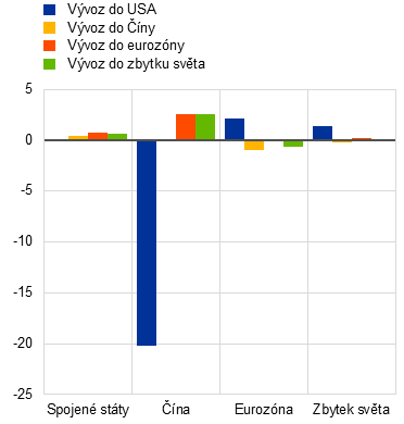 Poznámky: Graf ukazuje změny dvoustranného obchodu ve čtvrtém čtvrtletí 2027 (nevážené). Čína má částečně řízený směnný kurz. Pro zbytek světa je výpočet prováděn za pomoci prostého průměru odchylek vývozu od základní projekce pro všechny regiony v globálním modelu ECB s výjimkou Spojených států, Číny a eurozóny.