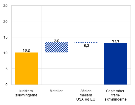 Sammenlignet med fremskrivningerne fra juni 2025 er USA's effektive toldsatser på import fra euroområdet og alle dets handelspartnere højere efter handelsaftalen mellem USA og EU og andre udmeldinger. ECB's stabs fremskrivninger tager højde for de toldsatser, pauser og undtagelser, der var gældende på skæringsdatoen for fremskrivningerne (28. august), og det antages, at de forbliver på samme niveau i hele fremskrivningsperioden.