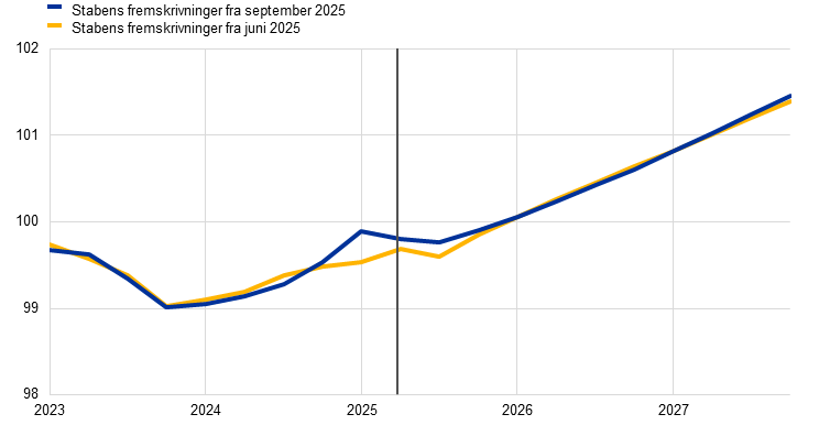 Inflationsudsigterne er i overensstemmelse med en inflation, der stabiliserer sig omkring målet på 2 pct. på mellemlangt sigt. Den samlede inflation, målt ved det harmoniserede forbrugerprisindeks (HICP), forventes at bevæge sig sidelæns på omkring 2 pct. i resten af 2025, og derefter forventes den at falde til 1,7 pct. i 2026 for derefter igen at stige til 1,9 pct. i 2027. Faldet i 2026 afspejler et yderligere gradvist fald i komponenterne ekskl. energi, mens energiinflationen forventes fortsat at være volatil, men at stige i fremskrivningsperioden, delvis på grund af iværksættelsen af EU's emissionshandelssystem 2 (ETS2) i 2027. Fødevareinflationen forventes i første omgang at forblive høj, fordi forsinkede virkninger af tidligere prisstigninger på fødevarer, som handles internationalt, slår igennem, men den forventes at svækkes til et niveau noget over 2 pct. i 2026 og 2027. HICP-inflationen ekskl. energi og fødevarer (HICPX) forventes at falde, fordi lønpresset aftager, og inflationen i servicesektoren falder, og fordi apprecieringen af euroen slår igennem i priskæden og lægger en dæmper på vareinflationen. En lavere lønvækst, som følge af at tidligere fald i reallønnen er blevet genvundet, kombineret med et opsving i produktivitetsvæksten, forventes at føre til en betydeligt langsommere vækst i enhedslønomkostningerne. Sammenlignet med fremskrivningerne fra juni 2025 er udsigterne for den samlede HICP-inflation blevet opjusteret med 0,1 procentpoint for både 2025 og 2026 på grund af højere resultater og antagelser for råvarepriserne på energi samt forsinkede virkninger af højere priser på fødevarer, der handles internationalt, som mere end opvejer apprecieringen af euroen. Fremskrivningen for 2027 domineres af de forsinkede virkninger af apprecieringen af euroen, hvilket har medført en nedjustering på 0,1 procentpoint.