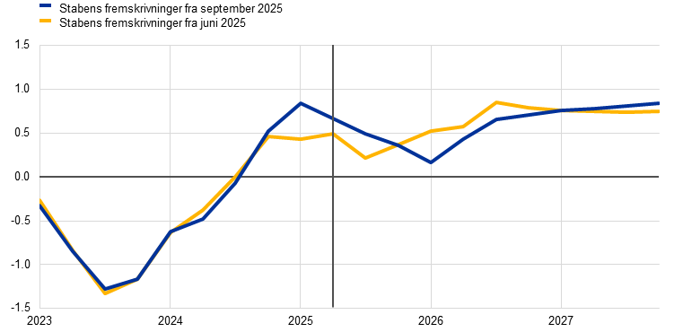 Den økonomiske aktivitet i euroområdet steg med 0,1 pct. i 2. kvartal 2025, hvilket var en smule under junifremskrivningerne, efter en meget stærkere vækst end anslået i 1. kvartal (figur 1). Som følge af resultatet for 1. kvartal 2025 og en opjustering af tallene for 4. kvartal 2024 var BNP-niveauet i 2. kvartal stadig ca. 0,5 pct. højere end forventet i junifremskrivningerne. I 1. kvartal 2025 var væksten kraftigt understøttet af fremrykningen af eksporten i forventning om højere amerikanske toldsatser. Denne virkning begyndte at aftage i 2. kvartal, primært – men ikke udelukkende – som følge af udviklingen i den irske lægemiddelsektor. På tværs af sektorerne var industriaktiviteten afdæmpet i 2. kvartal på baggrund af afviklingen af virkningen af fremrykningen. Samtidig fortsatte det underliggende opsving i efterspørgslen på varer som følge af stigende realindkomster, mens aktiviteten i servicesektoren fortsatte med at vokse.