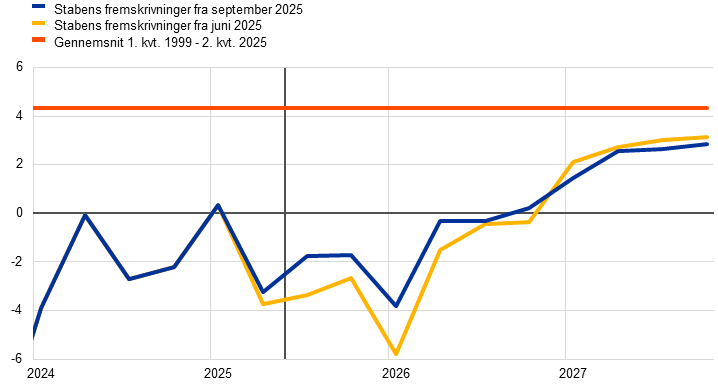 Anm.: Dataene er sæsonkorrigeret og korrigeret for antal arbejdsdage. De historiske data kan afvige fra Eurostats seneste publikationer på grund af data, som er offentliggjort efter skæringsdatoen for fremskrivningerne. Den lodrette linje angiver starten på fremskrivningsperioden. Justeringer beregnes på grundlag af uafrundede tal.