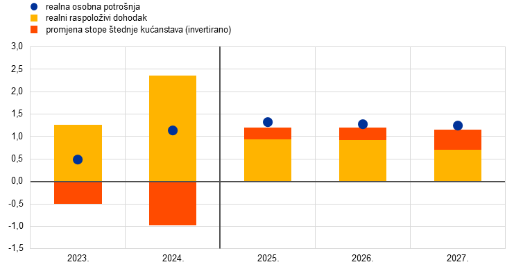 Izvori: Consensus Economics Forecasts, 14. kolovoza 2025. (podatci za 2027. uzeti su iz ankete iz srpnja 2025.); ESB‑ova Anketa o prognozama stručnjaka, 25. srpnja 2025.; Svjetski gospodarski izgledi MMF‑a, 23. srpnja 2025.; Gospodarski izgledi OECD‑a, 3. lipnja 2025.; Ekonomska prognoza Europske komisije iz proljeća 2025., 19. svibnja 2025.