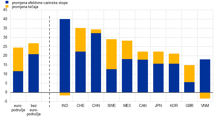U odnosu na projekcije iz lipnja 2025. efektivne carinske stope SAD‑a na uvoz iz europodručja i svih trgovinskih partnera više su nakon sklapanja trgovinskog sporazuma između SAD‑a i EU‑a i drugih najava. U projekcijama stručnjaka ESB‑a u obzir se uzimaju te carinske stope, njihovo zamrzavanje i izuzeća koji su bili na snazi na krajnji datum za projekcije (28. kolovoza) te se pretpostavlja da će ostati na jednakoj razini tijekom cijelog projekcijskog razdoblja.