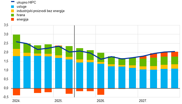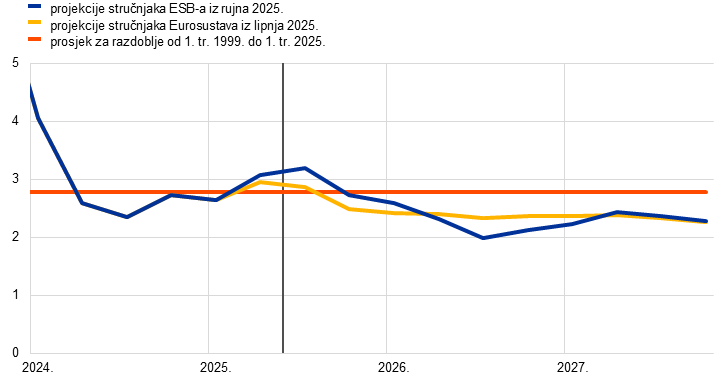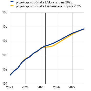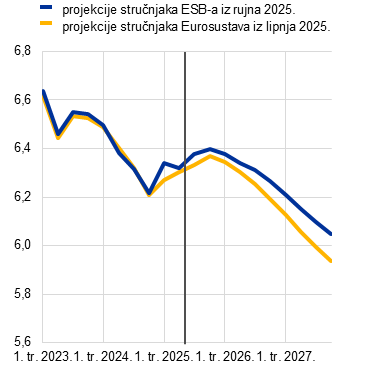 Inflacijski izgledi u skladu su sa stabiliziranjem inflacije na razinama oko srednjoročnog cilja od 2 %. Predviđa se da će ukupna inflacija mjerena harmoniziranim indeksom potrošačkih cijena (HIPC) uglavnom ostati nepromijenjena i iznositi oko 2 % u preostalom dijelu 2025. te da će se potom smanjiti na 1,7 % u 2026. i porasti na 1,9 % u 2027. Smanjenje u 2026. upućuje na daljnje postupno smanjenje komponenata inflacije bez energije. Inflacija cijena energije trebala bi pak i nadalje biti kolebljiva, ali porasti tijekom projekcijskog razdoblja, djelomično zbog uvođenja sustava EU‑a za trgovanje emisijama (ETS2) u 2027. Očekuje se da će inflacija cijena hrane u početku ostati povišena zbog prijenosa odgođenih učinaka prošlih povećanja međunarodnih cijena prehrambenih sirovina, ali da će se u 2026. i 2027. smanjiti na razine malo više od 2 %. Inflacija mjerena HIPC‑om bez energije i hrane trebala bi se smanjiti kako budu popuštali pritisci plaća i smanjivala se inflacija cijena usluga te kako se aprecijacija eura bude prenosila kroz cjenovni lanac i ograničavala inflaciju cijena dobara. Očekuje se da će manji rast plaća, kao posljedica nadoknađivanja prošlog pada realnih plaća, zajedno s oporavkom rasta produktivnosti znatno usporiti rast jediničnih troškova rada. U odnosu na projekcije iz lipnja 2025. izgledi za ukupnu inflaciju mjerenu HIPC‑om revidirani su naviše za 0,1 postotni bod za 2025. i 2026. zbog viših stvarnih i pretpostavljenih cijena energenata te zbog odgođenih učinaka viših međunarodnih cijena prehrambenih sirovina, koji više nego neutraliziraju aprecijaciju eura. Kada je riječ o 2027., predviđa se da će prevladavati odgođeni učinci aprecijacije eura, zbog čega je došlo do revizije naniže za 0,1 postotni bod.
