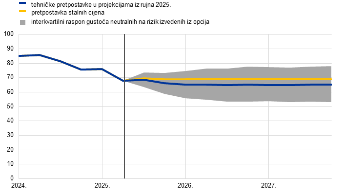 1. Krajnji datum za tehničke pretpostavke bio je 15. kolovoza 2025. Makroekonomske projekcije za međunarodno okružje i europodručje dovršene su 28. kolovoza 2025.
