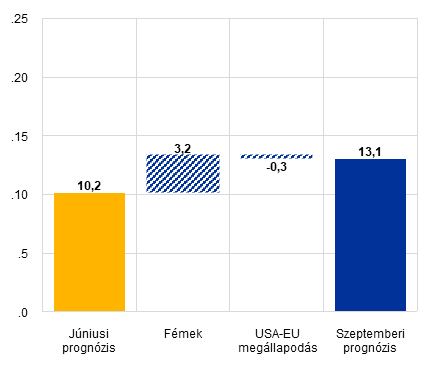 Megjegyzés: A függőleges vonal jelzi az előrejelzési időszak kezdetét. A módosítások kerekítetlen adatokon alapulnak. A csíkos, piros oszlop a 2025. első és második negyedévi eredményeknek az éven belüli növekedésre gyakorolt hatását mutatja.