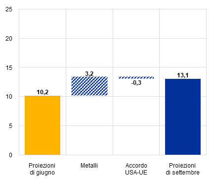 - Il dazio effettivo per le esportazioni di beni dell’area dell’euro negli Stati Uniti è assunto pari al 13,1%, in aumento rispetto al 10,2% ipotizzato nelle proiezioni di giugno (grafico A, pannello a). Ciò riflette l’accordo commerciale del 27 luglio 2025 e la successiva dichiarazione congiunta di Stati Uniti e Unione europea in cui si prevede che a tutti i beni non interessati dai dazi settoriali si applichi l’aliquota del 15% o, se superiore, quella della nazione più favorita (NPF). A titolo di raffronto, nell’esercizio previsivo dello scorso giugno era stato ipotizzato un dazio forfettario del 10%. A livello settoriale si registrano dazi più elevati per l’acciaio e per l’alluminio (50%, rispetto al 25% indicato nelle proiezioni di giugno) e un nuovo dazio del 50% sul contenuto di alluminio e acciaio di 407 prodotti, oltre che sul rame più in generale. Le autovetture e le componenti automobilistiche sono soggette a un dazio del 15% (inferiore rispetto al 25% prospettato nelle proiezioni di giugno), mentre agli aeromobili e alle parti di aeromobili si applica ora solo l’aliquota NPF[4]. Per i beni attualmente oggetto di un’indagine ai sensi della Sezione 232 – vale a dire i prodotti farmaceutici, i semiconduttori e il legname – si ipotizza che l’aliquota coincida con quella applicabile prima dell’insediamento dell’amministrazione Trump, vale a dire che sia prossima allo zero. Se si considera anche l’interscambio di servizi, il dazio effettivo si colloca all’8,1%, superiore di 1,8 punti percentuali al livello indicato nelle proiezioni di giugno.