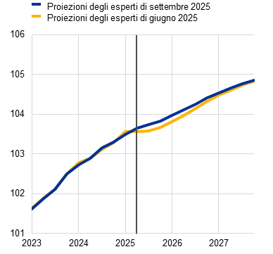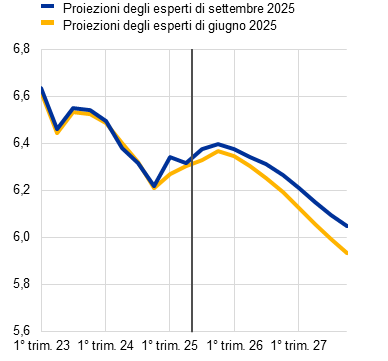 Le prospettive per l’inflazione sono coerenti con una stabilizzazione intorno all’obiettivo del 2% a medio termine. L’inflazione complessiva, misurata sull’indice armonizzato dei prezzi al consumo (IAPC), non evidenzierebbe alcuna tendenza significativa nel resto del 2025, mantenendosi attorno al 2%, per poi scendere all’1,7% nel 2026 e quindi risalire all’1,9% nel 2027. La diminuzione prospettata nel 2026 riflette un ulteriore graduale calo per le componenti non energetiche, mentre per i beni energetici l’inflazione dovrebbe continuare a mostrare variabilità ma aumentare nell’orizzonte di proiezione, in parte per effetto dell’avvio del sistema dell’UE per lo scambio di quote di emissione (ETS2) nel 2027. Per quanto riguarda la componente dei beni alimentari, ci si attende che l’inflazione resti inizialmente elevata, con la trasmissione degli effetti ritardati dei passati rincari delle materie prime alimentari sui mercati internazionali, ma poi dovrebbe scendere portandosi su livelli lievemente superiori al 2% nel 2026 e nel 2027. L’inflazione misurata sullo IAPC al netto delle componenti energetica e alimentare (HICPX) dovrebbe diminuire con l’attenuarsi delle pressioni salariali e la moderazione dell’inflazione relativa ai servizi, e man mano che l’apprezzamento dell’euro si trasmetterà lungo la catena di formazione dei prezzi e frenerà l’inflazione dei beni. Il rallentamento delle retribuzioni, essendo state recuperate le passate perdite nei salari reali, unitamente a una ripresa della crescita della produttività, dovrebbe determinare una significativa decelerazione del costo del lavoro per unità di prodotto. Rispetto alle proiezioni dello scorso giugno, le prospettive per l’inflazione complessiva misurata sullo IAPC sono state riviste al rialzo di 0,1 punti percentuali sia per il 2025 che per il 2026 a causa di dati effettivi e ipotesi sui prezzi delle materie prime energetiche più elevati, nonché degli effetti ritardati dei rincari delle materie prime alimentari sui mercati internazionali, che hanno più che compensato l’apprezzamento dell’euro. Nel 2027 si ritiene che prevarranno gli effetti ritardati del rafforzamento dell’euro, da cui deriva una revisione al ribasso di 0,1 punti percentuali.