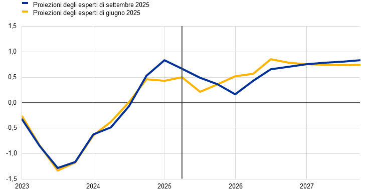 Le tariffe commerciali e la relativa incertezza hanno contribuito a forti oscillazioni dell’attività economica nella prima metà del 2025, con un’anticipazione dell’attività, soprattutto in Irlanda. Il venir meno di questi fattori nella seconda metà dell’anno dovrebbe determinare ulteriore volatilità, tale da confondere i segnali sulla dinamica di fondo dell’economia dell’area dell’euro. Di fatto, se non si considera la volatilità derivante dalle oscillazioni dei dati irlandesi, la crescita economica nel resto dell’area è stata più stabile e dovrebbe rimanere tale nella seconda metà dell’anno. Pur comportando un incremento dei dazi sulle esportazioni dell’area dell’euro verso gli Stati Uniti, il nuovo accordo commerciale tra Stati Uniti e UE ha contribuito a ridurre l’incertezza sulle politiche commerciali. Più avanti nell’orizzonte di riferimento la crescita economica dell’area dovrebbe rafforzarsi, sostenuta da vari fattori. L’aumento dei salari reali e dell’occupazione, unitamente ai nuovi stanziamenti pubblici per infrastrutture e difesa, soprattutto in Germania, dovrebbe stimolare la domanda interna dell’area. Inoltre, anche le condizioni di finanziamento meno restrittive, che riflettono principalmente le recenti decisioni di politica monetaria, e il recupero della domanda esterna nel 2027 dovrebbero sostenere le prospettive di crescita. Il tasso di incremento medio annuo del PIL in termini reali sarebbe pari all’1,2% nel 2025, all’1,0% nel 2026 e all’1,3% nel 2027. Rispetto alle proiezioni condotte lo scorso giugno dagli esperti dell’Eurosistema, le prospettive per la crescita del PIL sono state riviste al rialzo di 0,3 punti percentuali per il 2025, riflettendo dati più recenti migliori del previsto e un effetto di trascinamento derivante da revisioni dei dati storici. Si ritiene che i dati diversi dal previsto saranno solo in parte compensati nella seconda metà dell’anno, poiché non tutti riguardano un’anticipazione dell’attività superiore a quanto ipotizzato in precedenza. L’apprezzamento dell’euro e la maggiore debolezza della domanda esterna (in parte riconducibile al livello lievemente più elevato dei dazi rispetto alle ipotesi delle proiezioni di giugno) hanno determinato una revisione al ribasso di 0,1 punti percentuali per il 2026. La proiezione per il 2027 rimane invariata[1].