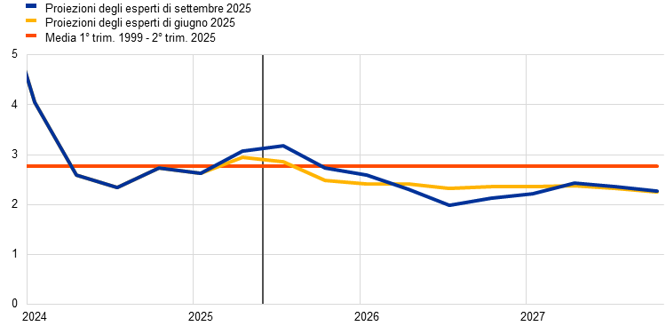 Proiezioni degli esperti della BCE | settembre 2025 | 1,2 | 1,0 | 1,3 | 2,1 | 1,7 | 1,9 | 2,4 | 1,9 | 1,8 |