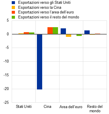 Nella simulazione dei dazi statunitensi condotta nello scenario di base, le importazioni degli Stati Uniti dalla Cina e dall’area dell’euro registrano un calo in termini cumulati rispettivamente pari al 23,5% e al 3,9% entro la fine del 2027. Inoltre, le esportazioni statunitensi verso la Cina e verso l’area dell’euro evidenziano una riduzione in termini cumulati rispettivamente pari al 4,9% e al 5,4% nello stesso periodo, mentre le esportazioni della Cina destinate all’area dell’euro aumentano dello 0,7%.