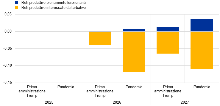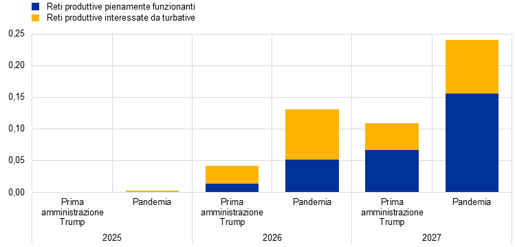 Gli effetti macroeconomici sull’area dell’euro sono minimi nel primo profilo alternativo, ma considerevoli nel secondo con turbative più estreme nelle catene di approvvigionamento al pari di quanto era avvenuto durante la pandemia. Concentrando anzitutto l’attenzione sui risultati in un’economia con reti produttive pienamente funzionanti, e utilizzando il modello ECB BASE, nel profilo con strozzature dal lato dell’offerta simili a quelle osservate durante la prima amministrazione Trump emergerebbero pressioni inflazionistiche solo minime e il tasso di inflazione misurato sullo IAPC sarebbe superiore di meno di 0,1 punti percentuali nel 2027 (grafico 20, pannello b), istogrammi blu). Lo scenario che ipotizza shock analoghi a quelli verificatisi durante il periodo pandemico determinerebbe effetti sull’inflazione più pronunciati in un contesto in cui il tasso calcolato sullo IAPC sarebbe superiore di fino a 0,15 punti percentuali nel 2027 (grafico 20, pannello b), istogrammi blu). In entrambe le analisi di sensibilità, l’impatto sul PIL in termini reali è trascurabile o lievemente positivo; ciò riflette l’ipotesi di tassi di interesse invariati e questo, in presenza di un aumento dell’inflazione, implica una riduzione dei tassi di interesse reali che fornirebbe uno stimolo all’attività (grafico 20, pannello a), istogrammi blu). L’analisi è estesa utilizzando un modello multi-paese e multi-settore che tiene conto dei legami di input-output in un contesto in cui ai disturbi nelle catene di approvvigionamento si aggiungono turbative nelle reti produttive in altre regioni. Tale ipotesi riduce la sostituibilità all’interno delle catene produttive e determinerebbe effetti più pronunciati (grafico 20, istogrammi gialli). In questo caso, rispetto allo scenario di base, l’inflazione nel 2027 potrebbe essere superiore di fino a 0,1 punti percentuali nello scenario della prima amministrazione Trump e di quasi 0,25 punti percentuali nello scenario pandemico più estremo, mentre la crescita del PIL risulterebbe lievemente frenata[19].