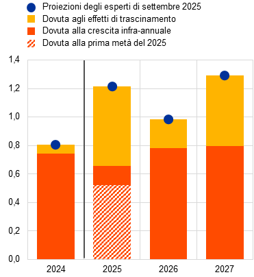 Nota: la linea verticale indica l’inizio dell’orizzonte temporale di proiezione. Le revisioni sono basate su dati non arrotondati. L’istogramma a righe rosse mostra l’impatto dei dati relativi al primo e al secondo trimestre dell’anno sulla crescita infra-annuale per il 2025.