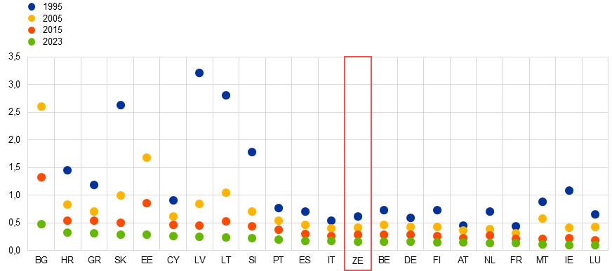 Για λεπτομέρειες σχετικά με τις προηγούμενες αξιολογήσεις των επιδράσεων του ΣΕΔΕ2 στο βασικό σενάριο των προβολών, βλ. το Πλαίσιο 2 με τίτλο «Αξιολόγηση των επιδράσεων στην ανάπτυξη και τον πληθωρισμό από τις πολιτικές πράσινες μετάβασης», στις μακροοικονομικές προβολές των εμπειρογνωμόνων του Ευρωσυστήματος για τη ζώνη του ευρώ του Δεκεμβρίου του 2024.