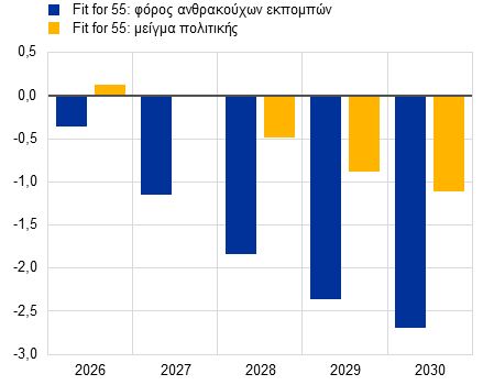 Το βασικό σενάριο των προβολών δεν περιλαμβάνει την επίδραση από τυχόν περαιτέρω μέτρα της ΕΕ που αποτελούν μέρος της δέσμης μέτρων «Fit for 55», καθώς η επίδρασή τους είτε δεν εκτιμήθηκε είτε διαπιστώθηκε ότι ήταν αμελητέα. Αυτό συνάδει με τις οικονομικές προβλέψεις του φθινοπώρου 2025 της Ευρωπαϊκής Επιτροπής, σύμφωνα με τις οποίες εκτιμάται ότι η επίδραση του μηχανισμού συνοριακής προσαρμογής άνθρακα (ΜΣΠΑ) στον πληθωρισμό βραχυπρόθεσμα θα είναι αμελητέα.
