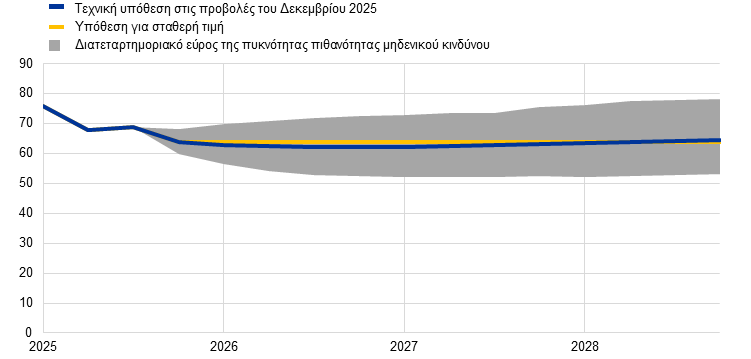 Όσον αφορά τις τεχνικές υποθέσεις, σε σύγκριση με τις προβολές του Σεπτεμβρίου οι μεταβολές είναι συνολικά περιορισμένες, εκτός από τις υποθέσεις για τις τιμές της ενέργειας και τις τιμές στο πλαίσιο του ΣΕΔΕ. Οι υποθέσεις για τις τιμές του πετρελαίου έχουν αναθεωρηθεί προς τα κάτω κατά περίπου 4% κατά μέσο όρο για το 2026-27 και οι υποθέσεις για τις τιμές χονδρικής του φυσικού αερίου κατά 8,6%, ενώ η υπόθεση για την τιμή των δικαιωμάτων εκπομπών στο πλαίσιο του ΣΕΔΕ1 με βάση τα συμβόλαια μελλοντικής εκπλήρωσης έχει αυξηθεί σημαντικά, κατά περίπου 15%. Μετά από τις πρόσφατες ανακοινώσεις, η εισαγωγή του συστήματος ΣΕΔΕ2 θεωρείται πλέον ότι θα αναβληθεί για ένα έτος, για το 2028, και η υπόθεση για την τιμή βασίζεται στην τιμή που χρησιμοποίησε η Ευρωπαϊκή Επιτροπή στις οικονομικές προβλέψεις του φθινοπώρου 2025 (46 ευρώ ανά τόνο CO2, η οποία είναι σημαντικά χαμηλότερη από την τιμή των 59 ευρώ ανά τόνο CO2 που είχε εκτιμηθεί για το 2027 στις προηγούμενες προβολές του Ευρωσυστήματος/της ΕΚΤ· βλ. Πλαίσιο 2 για περισσότερες λεπτομέρειες).[6] Το ευρώ υποτιμήθηκε κατά 0,5% έναντι του δολαρίου ΗΠΑ και κατά 0,1% σε όρους ονομαστικής σταθμισμένης συναλλαγματικής ισοτιμίας σε σχέση με τις προβολές του Σεπτεμβρίου. Οι υποθέσεις για τα βραχυπρόθεσμα επιτόκια έχουν αναθεωρηθεί οριακά μόνο, ενώ οι υποθέσεις για τα μακροπρόθεσμα επιτόκια έχουν αναθεωρηθεί προς τα κάτω κατά 0,2 ποσ. μον. τόσο για το 2026 όσο και για το 2027.
