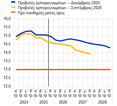 Ο ρυθμός αύξησης του κόστους εργασίας ανά μονάδα προϊόντος αναμένεται, βάσει των προβολών, να επιβραδυνθεί έως και το 2027, λόγω της χαμηλότερης αύξησης των μισθών και, ως έναν βαθμό, της υψηλότερης παραγωγικότητας, και στη συνέχεια να σταθεροποιηθεί σε 2,1% το 2028. Ο ρυθμός αύξησης του κόστους εργασίας ανά μονάδα προϊόντος επιταχύνθηκε ελαφρώς το γ΄ τρίμηνο του 2025 και αναμένεται να παραμείνει πάνω από 3% έως τις αρχές του 2026. Η χαλάρωση του ρυθμού αύξησης των αμοιβών ανά απασχολούμενο αναμένεται να οδηγήσει σε επιβράδυνση του ρυθμού αύξησης του κόστους εργασίας ανά μονάδα προϊόντος καθ’ όλη τη διάρκεια του 2026. Κατά μέσο όρο, ο ρυθμός αύξησης του κόστους εργασίας ανά μονάδα προϊόντος αναμένεται να μετριαστεί από 3,3% το 2025 σε 2,6% το 2026 και 2,0% το 2027 και στη συνέχεια να αυξηθεί σε 2,1% το 2028, ελαφρώς πάνω από τον μακροχρόνιο μέσο όρο του. Σε σύγκριση με τις προβολές του Σεπτεμβρίου 2025, ο ρυθμός αύξησης του κόστους εργασίας ανά μονάδα προϊόντος έχει αναθεωρηθεί προς τα πάνω για κάθε έτος του χρονικού ορίζοντα προβολής λόγω της εντονότερης αύξησης των μισθών, παρά την ελαφρώς υψηλότερη παραγωγικότητα.
