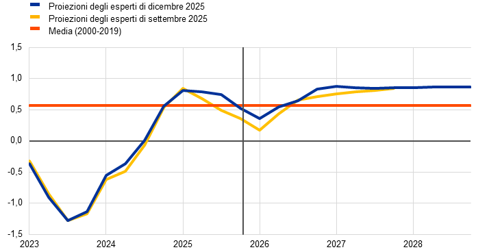 Le ipotesi tecniche e le proiezioni per l’economia mondiale sono aggiornate al 26 novembre 2025. Le proiezioni macroeconomiche per l’area dell’euro sono state ultimate il 3 dicembre 2025. Le proiezioni per l’area dell’euro formulate a dicembre 2025 includono la Bulgaria in ragione dell’adesione del paese all’area il 1° gennaio 2026. I dati storici per l’area dell’euro includono anche la Bulgaria per tutte le variabili tranne l’indice armonizzato dei prezzi al consumo (IAPC).