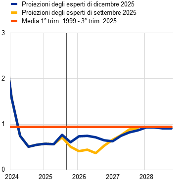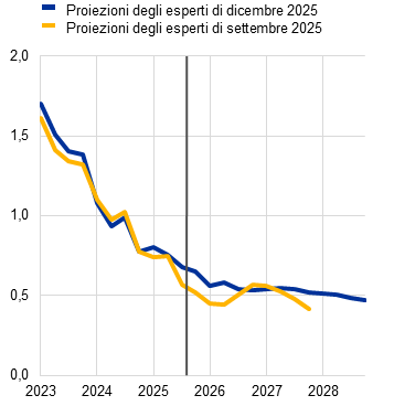Proiezioni degli esperti dell’Eurosistema | dicembre 2025 | 1,4 | 1,2 | 1,4 | 1,4 | 2,1 | 1,9 | 1,8 | 2,0 | 2,4 | 2,2 | 1,9 | 2,0 | |