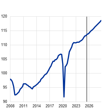 De economie van het eurogebied geeft blijk van veerkracht in een uitdagende mondiale omgeving. Het reële bbp steeg in het derde kwartaal van 2025 met 0,3%, wat hoger was dan in de projecties van september werd voorzien. Dit volgde op volatiele ontwikkelingen in de eerste helft van het jaar, te wijten aan het vervroegd uitvoeren van orders (frontloading) in reactie op hogere Amerikaanse invoerheffingen en de onzekerheid daaromtrent, alsook aan sterke schommelingen in de Ierse gegevens. De binnenlandse vraag zou de belangrijkste stuwende kracht achter de groei in het eurogebied moeten blijven, ondersteund door de stijging van de reële lonen en de werkgelegenheid, tegen de achtergrond van veerkrachtige arbeidsmarkten met historisch lage werkloosheidscijfers. Ook de dit jaar aangekondigde extra overheidsuitgaven voor infrastructuur en defensie, met name in Duitsland, samen met de verbeterde financieringsvoorwaarden als gevolg van de verlagingen van de monetairbeleidsrente sinds juni 2024, zullen de binnenlandse economie naar verwachting ondersteunen. Wat betreft externe factoren wordt verwacht dat de uitvoer volgend jaar zal aantrekken, hoewel de uitdagingen op het gebied van het concurrentievermogen blijven bestaan, waaronder sommige van structurele aard. Deze verbetering is toe te schrijven aan een opleving van de buitenlandse vraag door de afnemende onzekerheid over het handelsbeleid, ondanks het geleidelijk groter wordend effect van de hogere invoerheffingen. De gemiddelde reële bbp-groei op jaarbasis komt volgens de projecties uit op 1,4% in 2025, 1,2% in 2026 en 1,4% in zowel 2027 als 2028. Ten opzichte van de projecties van september 2025 is de bbp-groei voor de gehele projectieperiode opwaarts bijgesteld als gevolg van meevallende gegevens, verminderde handelsonzekerheid, een sterkere buitenlandse vraag en lagere prijzen van energiegrondstoffen.[1]