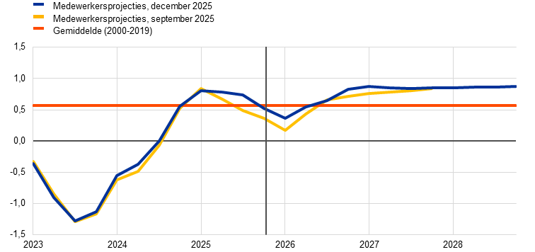 Veranderingen in de invoerprijzen blijven tot begin 2026 licht negatief en worden daarna gematigd positief, wanneer het temperende effect van de eerdere appreciatie van de euro wegebt. De groei van de invoerdeflator op jaarbasis stijgt van -0,1% in 2025 tot 0,7% in 2026, en stijgt in 2027 en 2028 sterker door tot respectievelijk 1,7% en 1,8%. De neerwaartse bijstelling van de invoerprijsinflatie voor 2025 ten opzichte van de projecties van september 2025 vloeit tevens voort uit recente cijfers en is in overeenstemming met lagere aannames voor de prijzen van energiegrondstoffen. De kleine opwaartse bijstelling voor 2026 hangt samen met de iets zwakkere wisselkoers gedurende de projectieperiode (zie Kader 1), terwijl de invoerprijsdeflator voor 2027 ongewijzigd is gebleven.