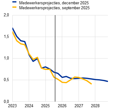 De inflatie zal naar verwachting dalen van 2,1% in 2025 naar 1,9% in 2026 en vervolgens naar 1,8% in 2027, alvorens in 2028 te stijgen naar de doelstelling van de ECB van 2% op middellange termijn. De verwachte daling van de totale inflatie (gemeten aan de hand van de geharmoniseerde consumptieprijsindex (HICP)) begin 2026 weerspiegelt een neerwaarts basiseffect van de energieprijzen, terwijl de inflatie in de niet-energiecomponenten gedurende 2026 zou moeten blijven afnemen. De bijdrage van de energie-inflatie aan de totale inflatie blijft tot eind 2027 gematigd, alvorens in 2028 aanzienlijk te stijgen als gevolg van de verwachte invoering van het EU-emissiehandelssysteem 2 (ETS2), met een opwaarts effect van 0,2 procentpunt op de totale inflatie. Volgens de projecties daalt de HICP-inflatie exclusief energie van 2,5% in 2025 naar 2,2% in 2026 en 2,0% in 2027 en 2028. De verwachting is dat de voedselinflatie aanmerkelijk zal dalen naarmate de effecten van de eerdere wereldwijde prijsstijgingen van voedingsgrondstoffen en de ongunstige weersomstandigheden gedurende de zomer afnemen. Vanaf eind 2026 stabiliseert de voedselinflatie zich dan iets boven de 2%. De HICP-inflatie exclusief energie en voedingsmiddelen (HICPX) matigt van 2,4% in 2025 tot 2,0% in 2028, doordat de diensteninflatie daalt tegen de achtergrond van afnemende arbeidskostendruk en naarmate de eerdere appreciatie van de euro doorwerkt in de prijsketen, waardoor de goedereninflatie wordt afgeremd. Verwacht wordt dat de loongroei geheel 2026 gematigd zal blijven, alvorens zich rond 3% te stabiliseren, ondersteund door een veerkrachtige arbeidsmarkt en een productiviteitsgroei net onder de 1%. De groei van de arbeidskosten per eenheid product zal naar verwachting afnemen, hoewel het effect daarvan op de inflatie deels tenietgedaan wordt door een geleidelijk herstel van de winstmarges gedurende de projectieperiode. Vergeleken met de projecties van september 2025 zijn de vooruitzichten voor de totale HICP-inflatie voor 2026 met 0,2 procentpunt naar boven toe bijgesteld vanwege de recente onverwacht hogere cijfers voor de HICP-inflatie en de loongroei. Deze laatste factor heeft geleid tot een aanzienlijke opwaartse herziening van de loonvooruitzichten. De projectie voor de HICP-inflatie voor 2027 is licht neerwaarts bijgesteld als gevolg van een veronderstelde lagere bijdrage van de energie-inflatie, aangezien de invoering van ETS2 nu naar verwachting wordt uitgesteld van 2027 tot 2028, hoewel deze bijdrage deels wordt gecompenseerd door een sterkere diensteninflatie.
