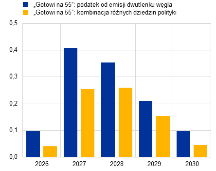 W scenariuszu bazowym projekcji nie uwzględniono skutków żadnych dalszych unijnych środków objętych pakietem „Gotowi na 55”, ponieważ ich wpływ nie został oszacowany albo uznano go za znikomy. Jest to spójne z prognozą gospodarczą Komisji Europejskiej „European Economic Forecast. Autumn 2025”, w której oszacowano, że mechanizm dostosowywania cen na granicach z uwzględnieniem emisji CO2 ma znikomy wpływ na inflację w krótkim okresie.